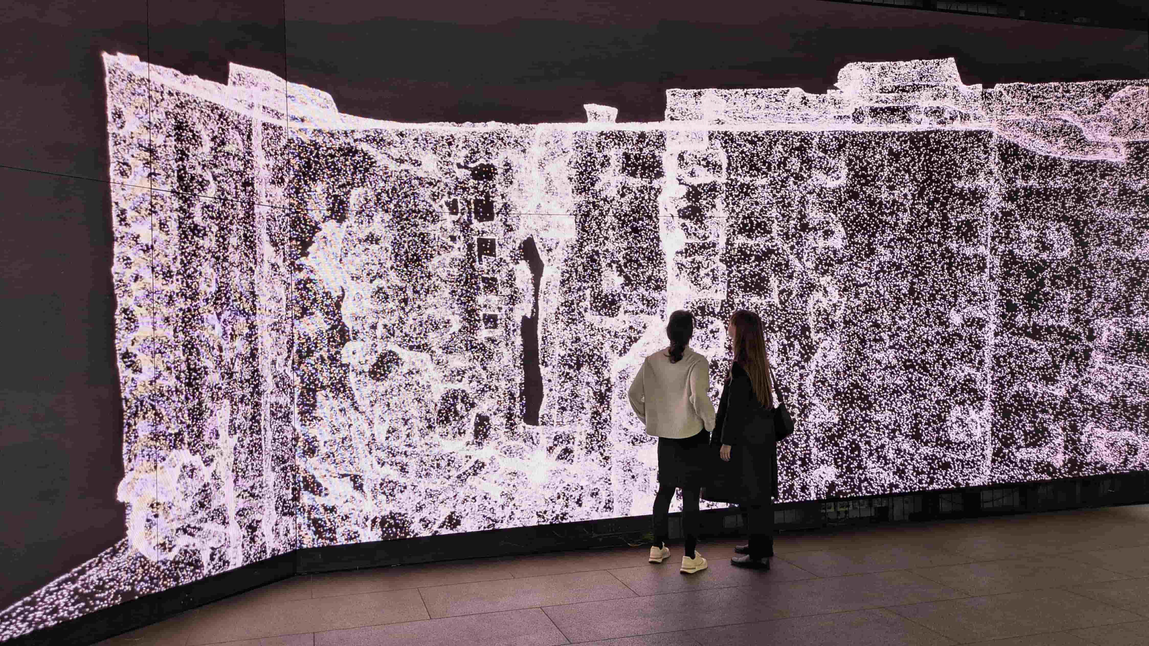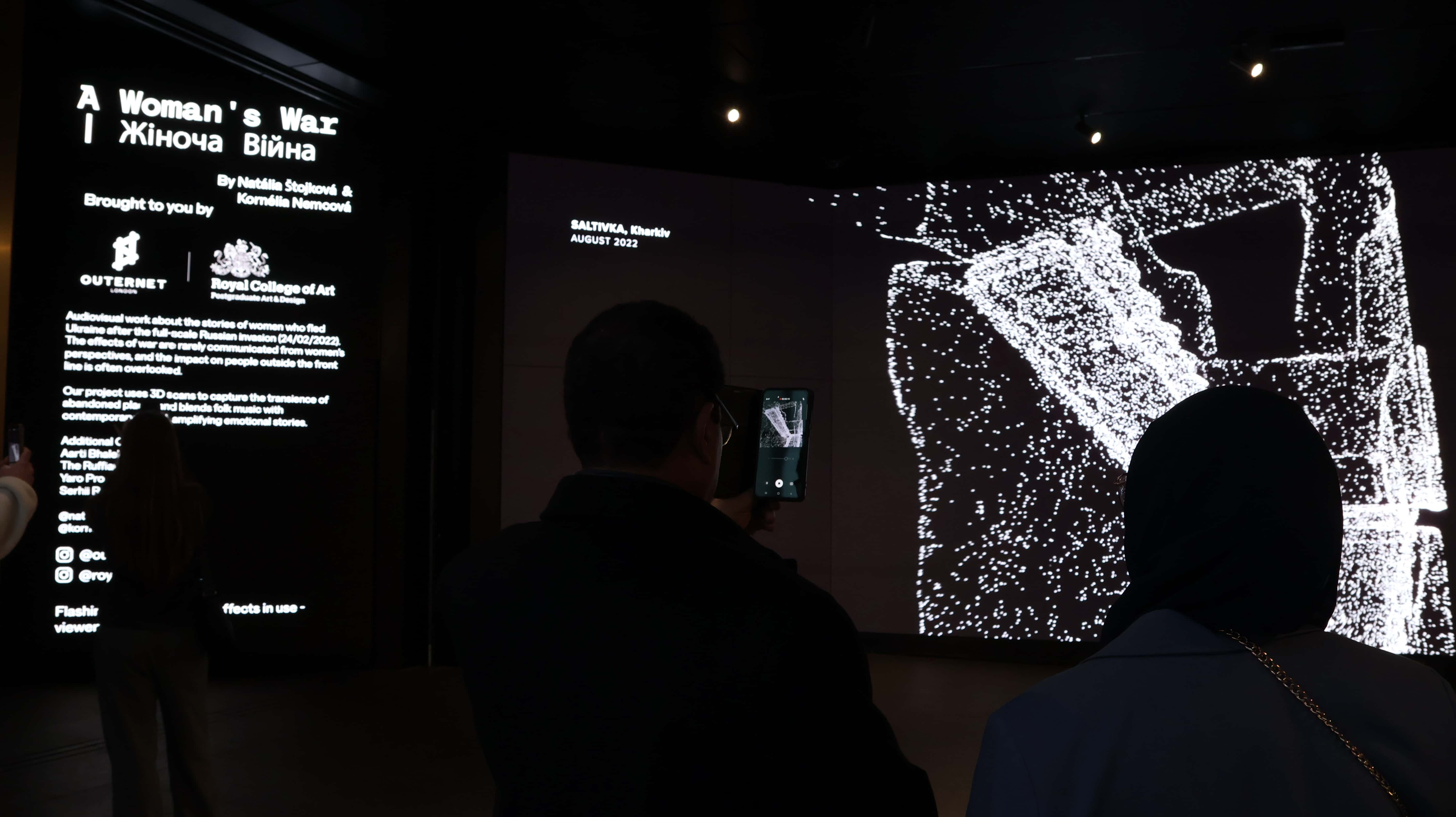 The work was deliberately structured around short, self-contained visual sequences drawn from 3D scans of Ukrainian landscapes, allowing audiences to engage meaningfully in passing rather than requiring sustained attention. The particle-based visuals proved particularly effective in high-footfall environments, generating spontaneous audience engagement and becoming a focal point that people chose to stop and photograph.