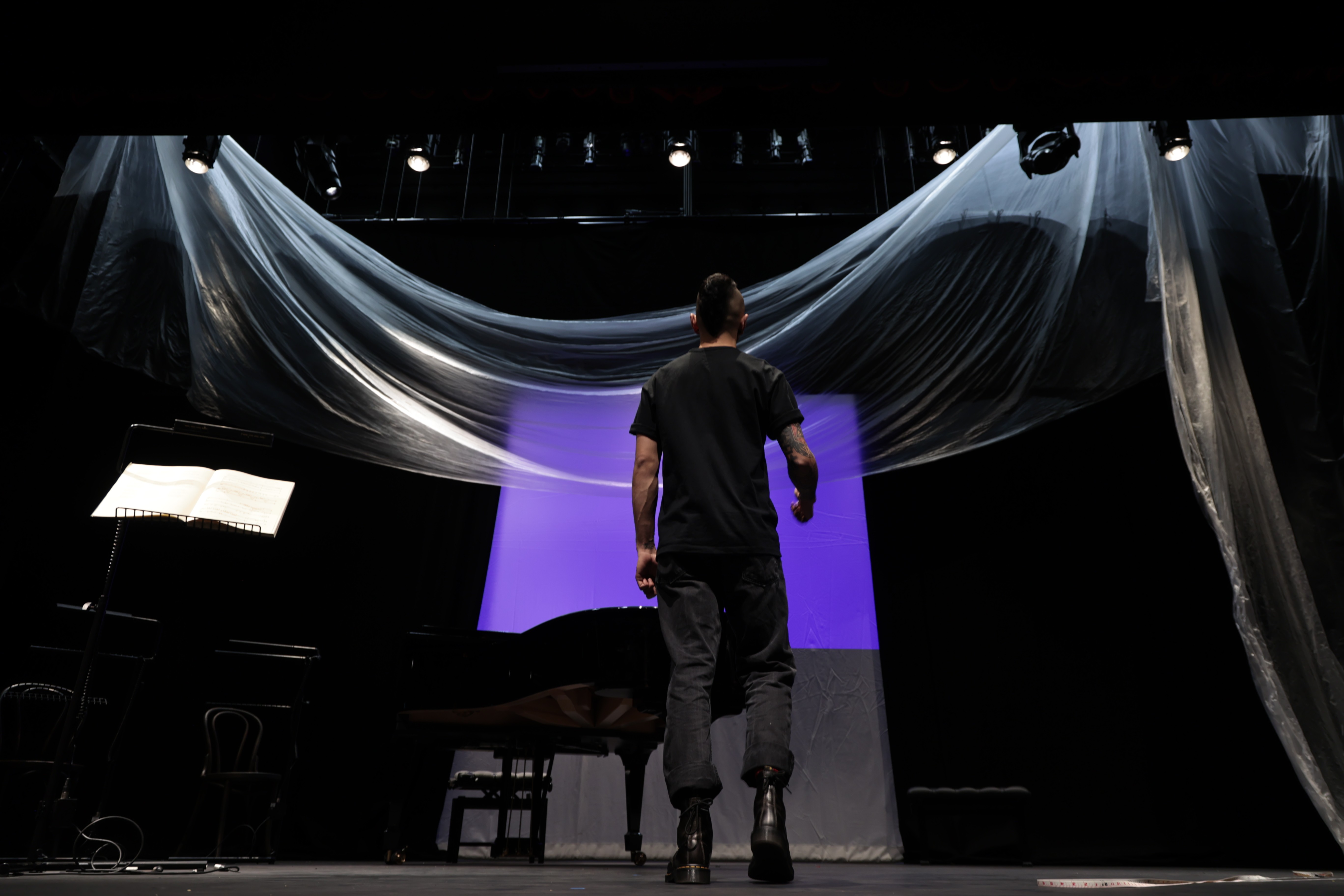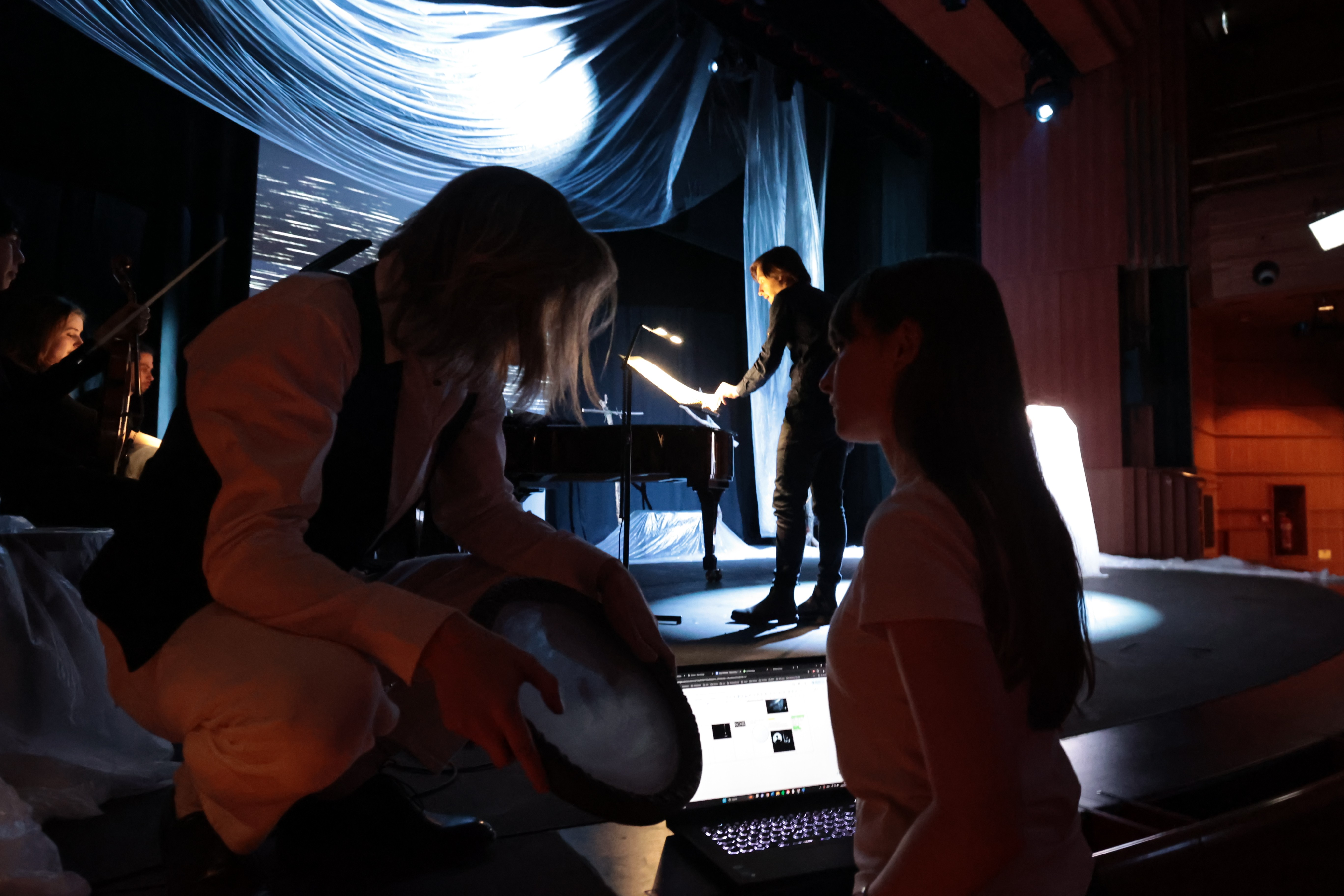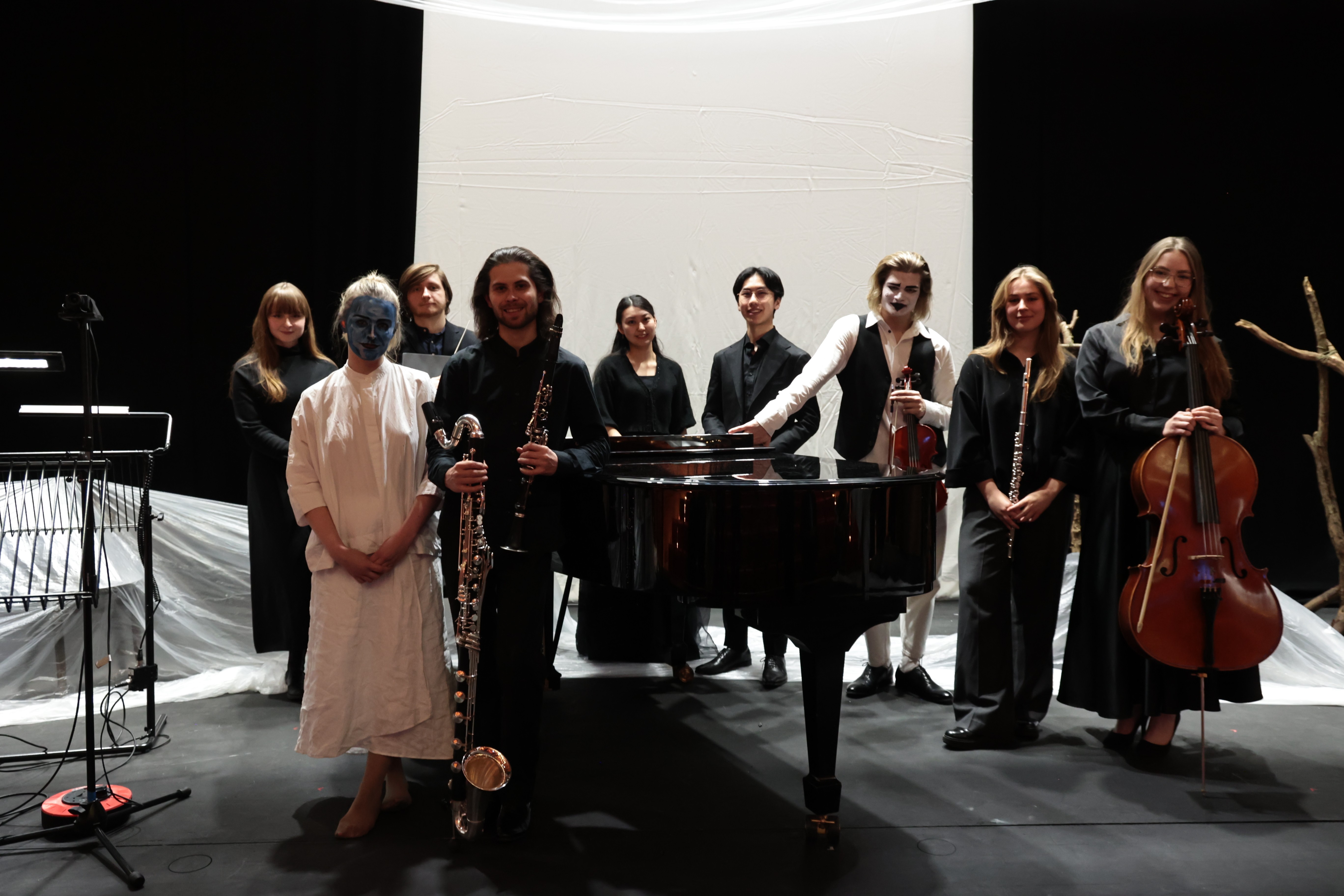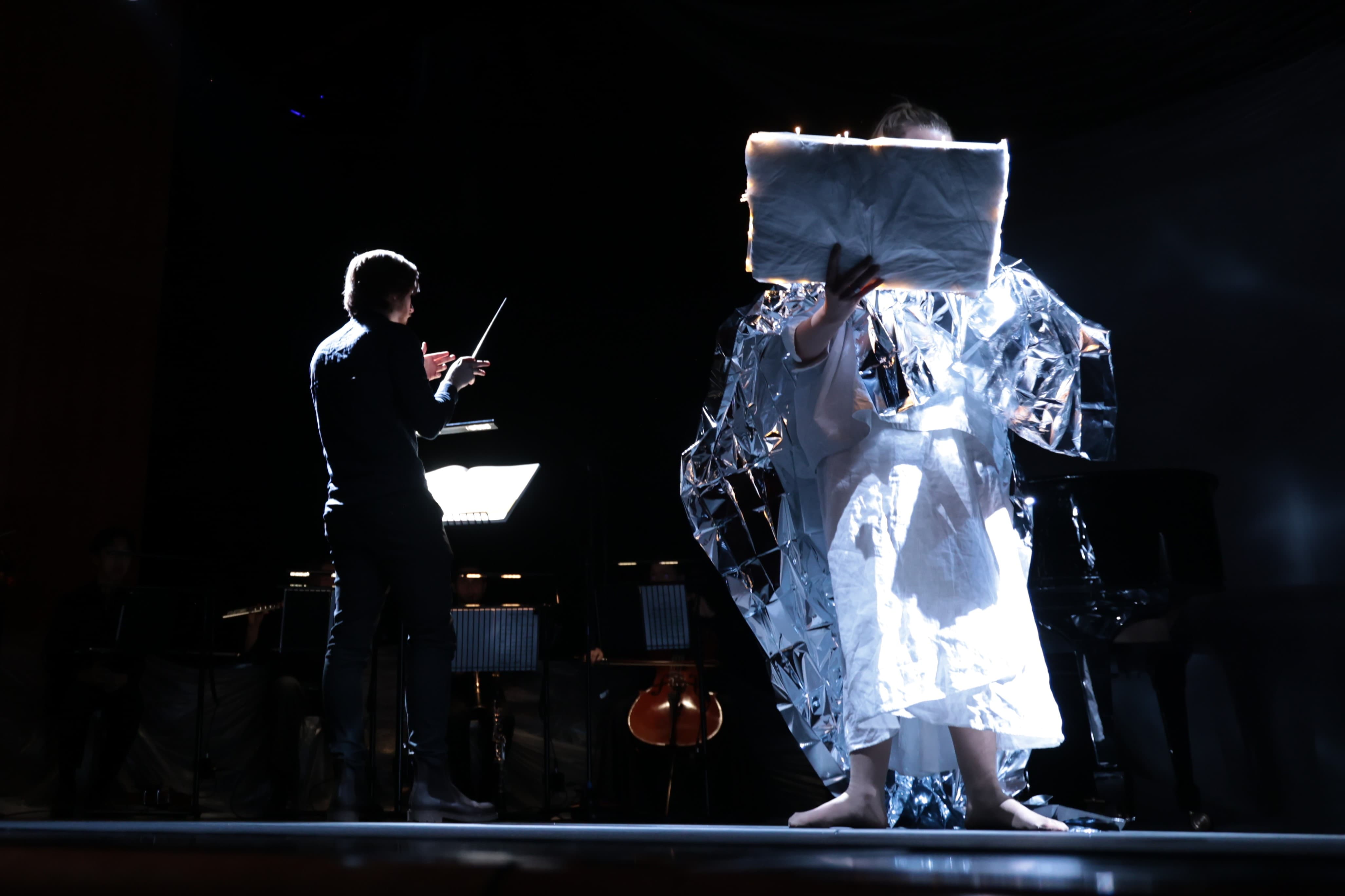 Coordinating 23 people — spanning visual artists, stage technicians, and marketing — required clear communication structures and a shared creative framework from the outset. I made sure every collaborator understood not just their individual brief, but the overarching conceptual logic of the production, so that decisions could be made independently without losing coherence. The rehearsal-driven process was key to this. It created a space where the staging could evolve organically while keeping the whole team aligned around the same artistic vision.