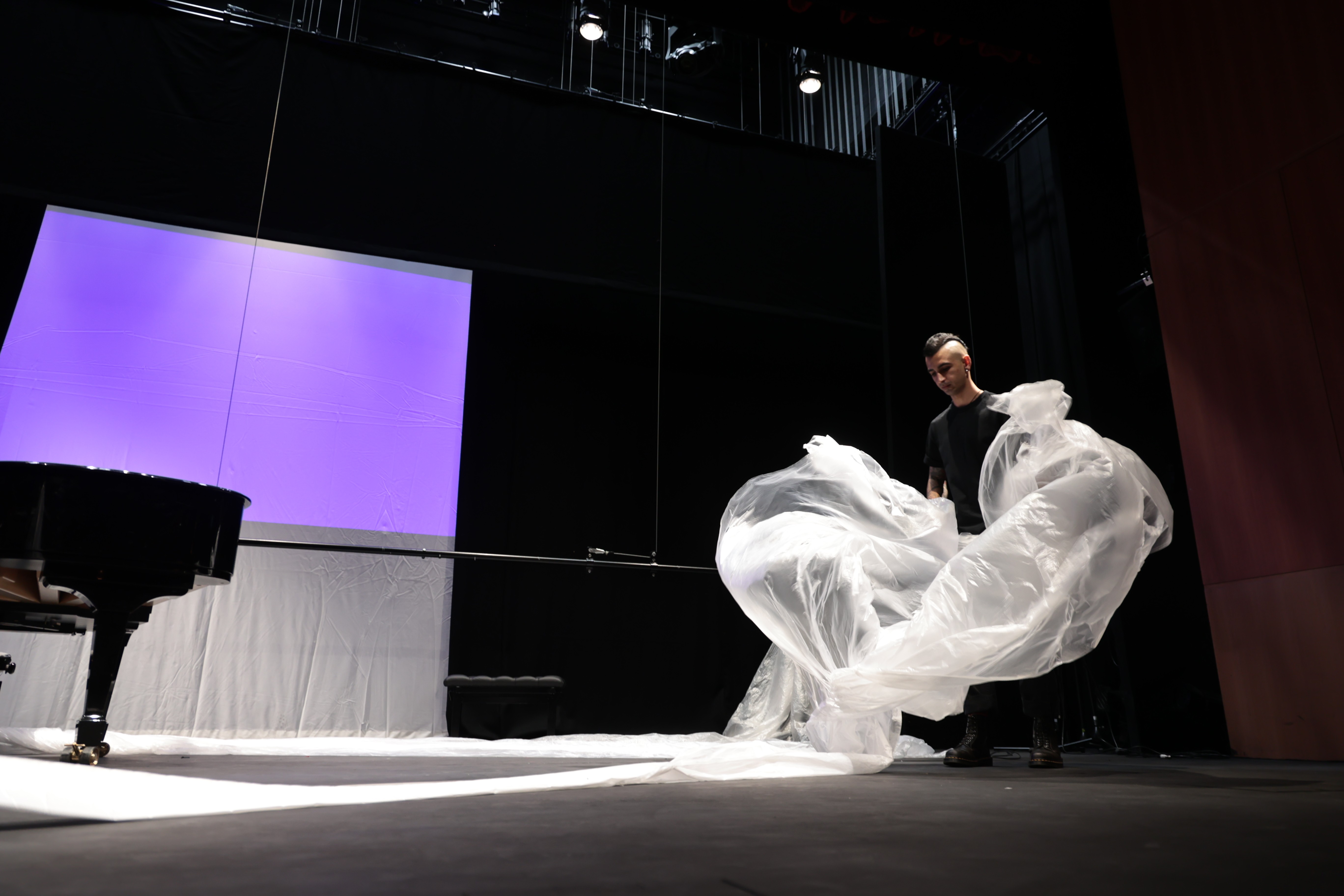 The entire production was developed and staged in under two months, with no external budget — relying entirely on in-house equipment and materials. Rather than treating these as limitations, they became creative parameters. The decision to centre the visual concept around a single plastic dust sheet, for example, came directly from the constraint of minimal resources. Working within tight boundaries forced early conceptual clarity and disciplined decision-making, which ultimately gave the production a stronger and more coherent visual identity than a larger budget might have allowed.