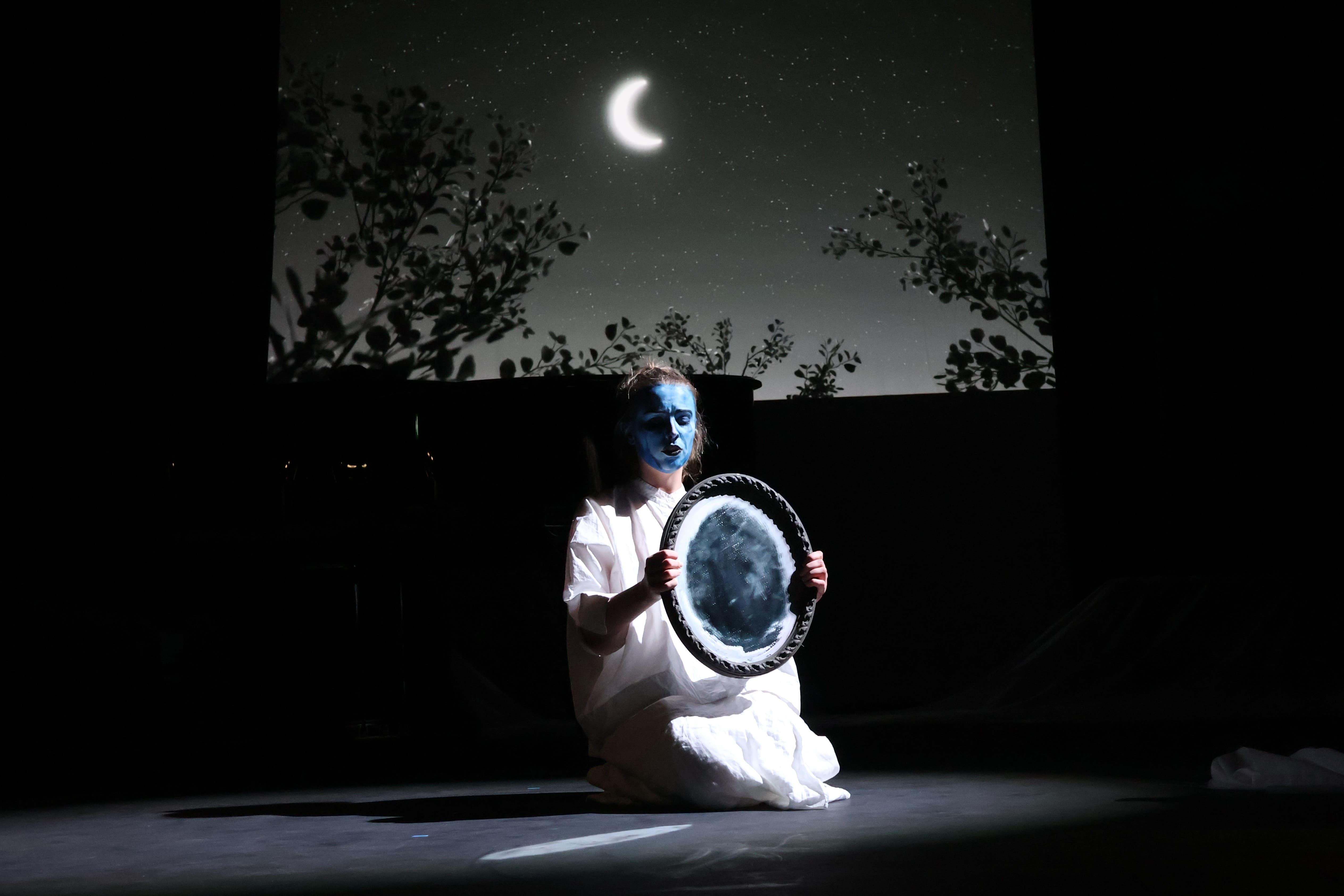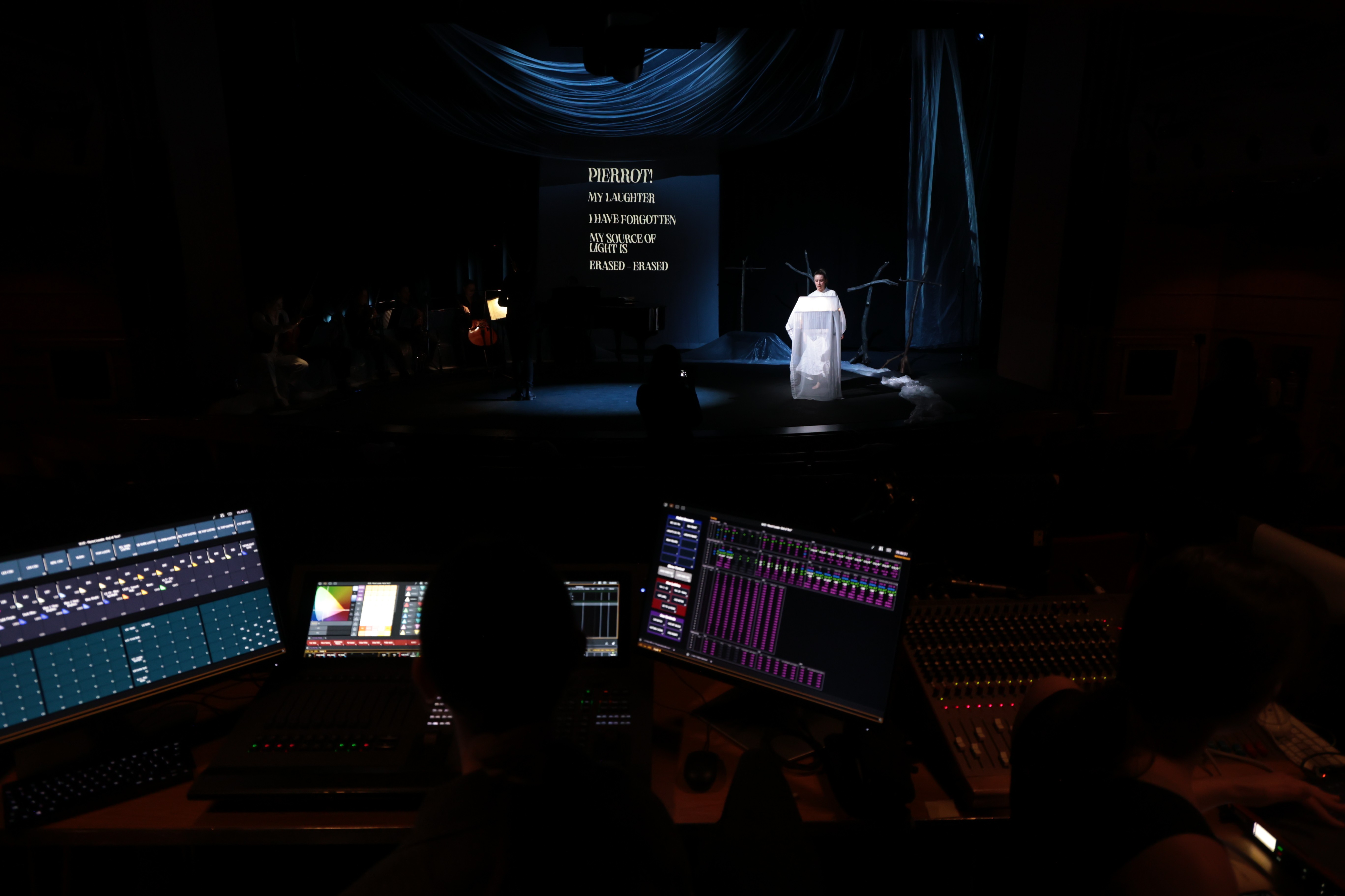 A stage production of Schönberg's Pierrot Lunaire at the Royal Academy of Music, reimagining the 40-minute atonal song cycle through projection, scenography, and psychological visual storytelling.