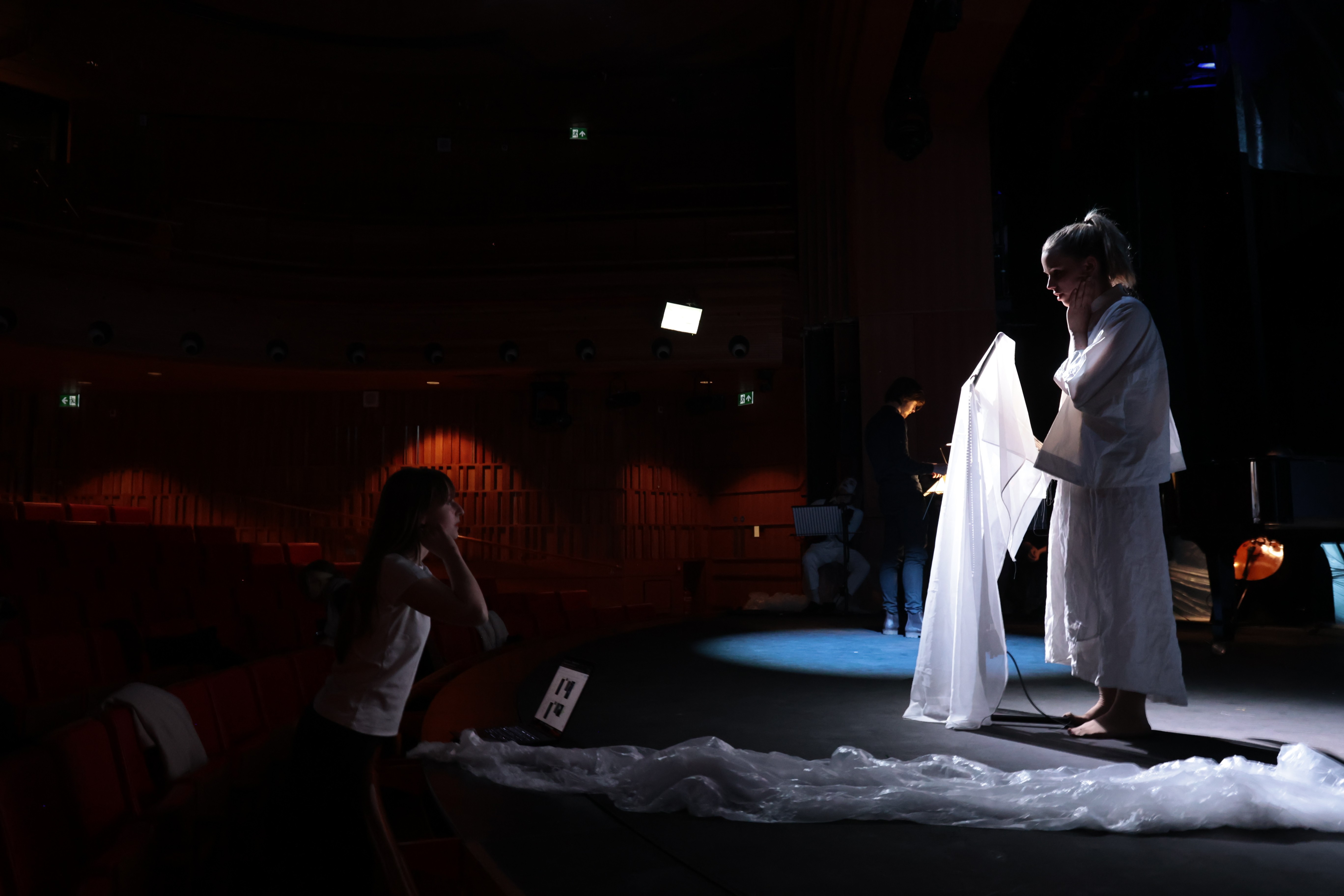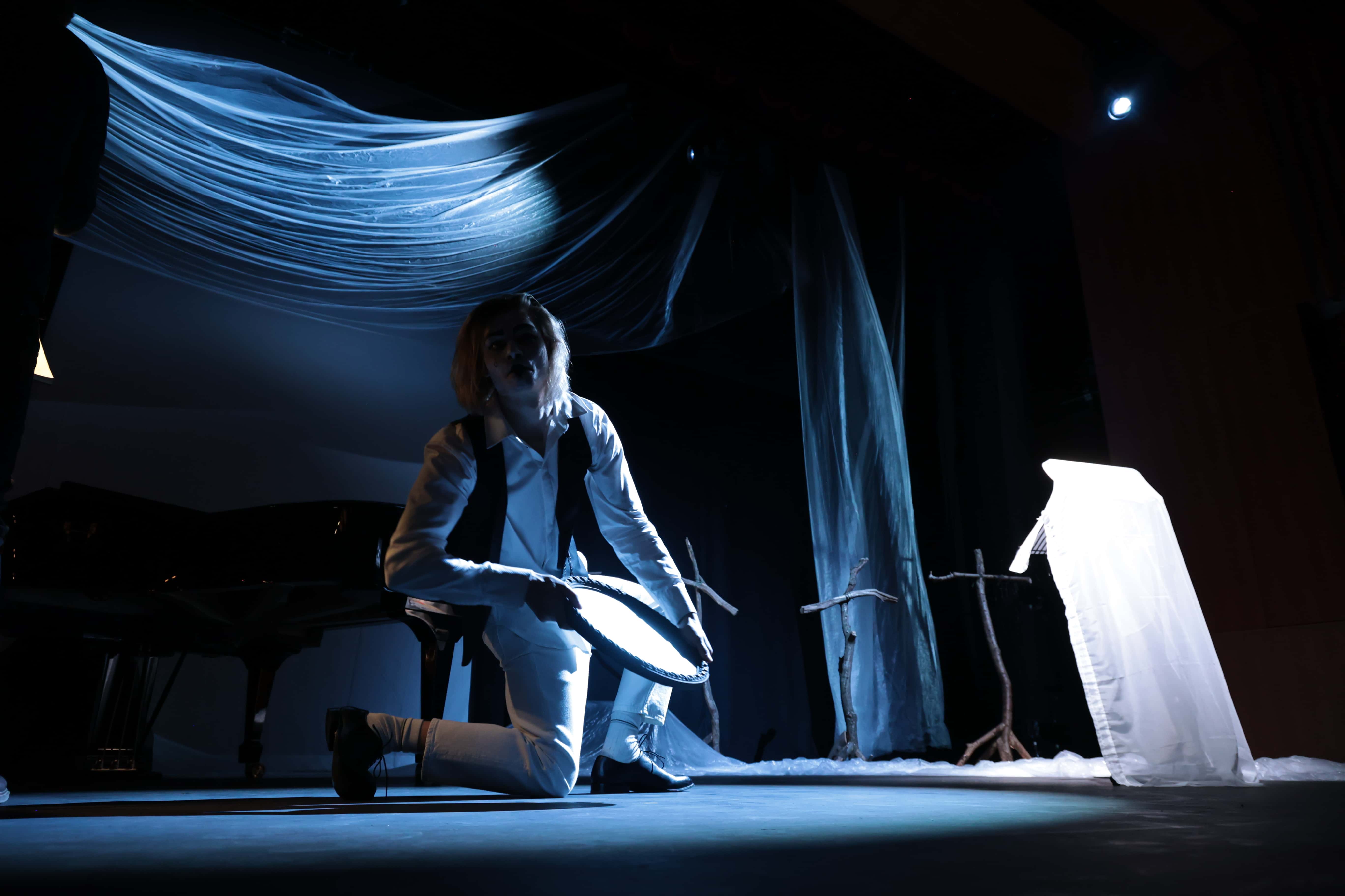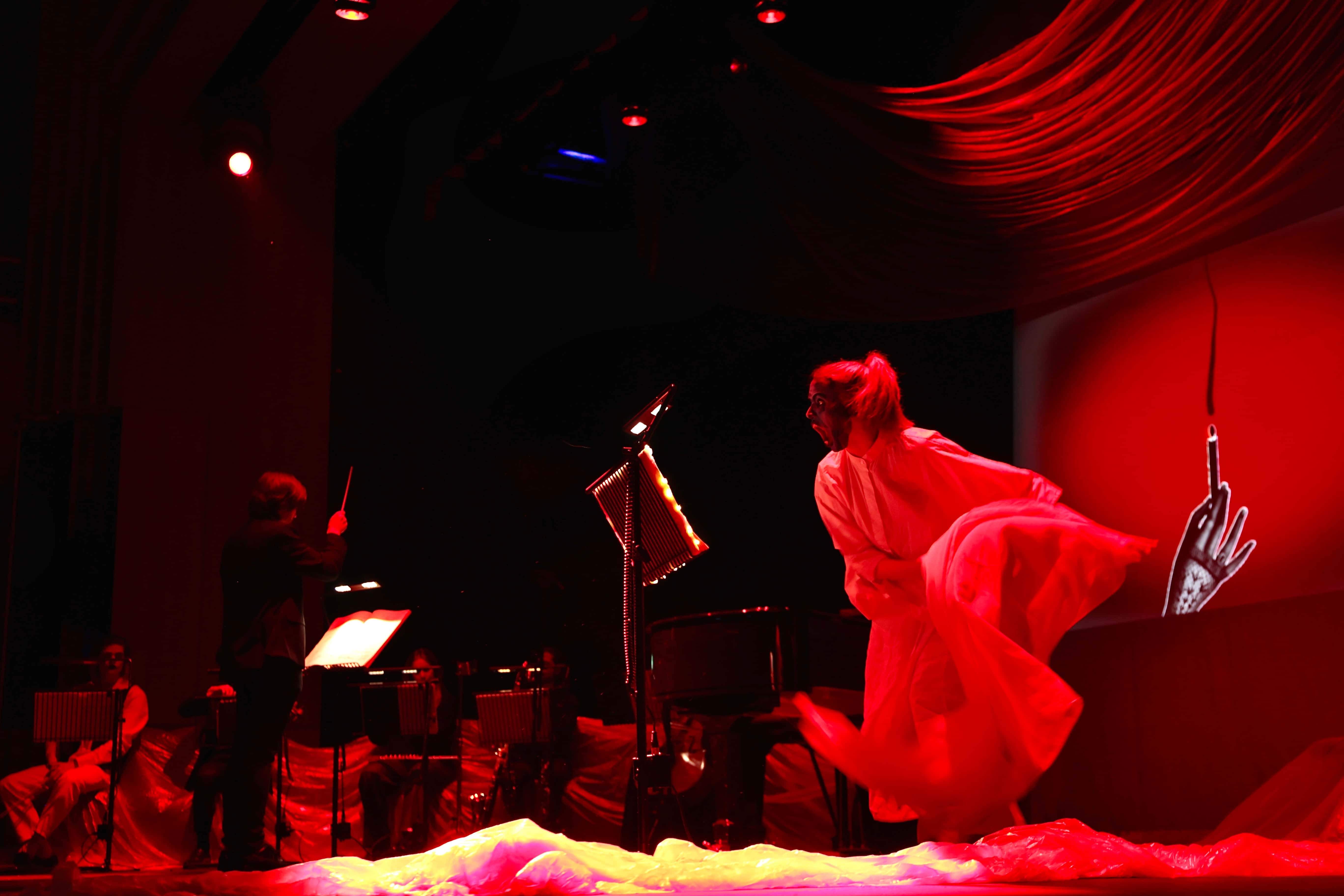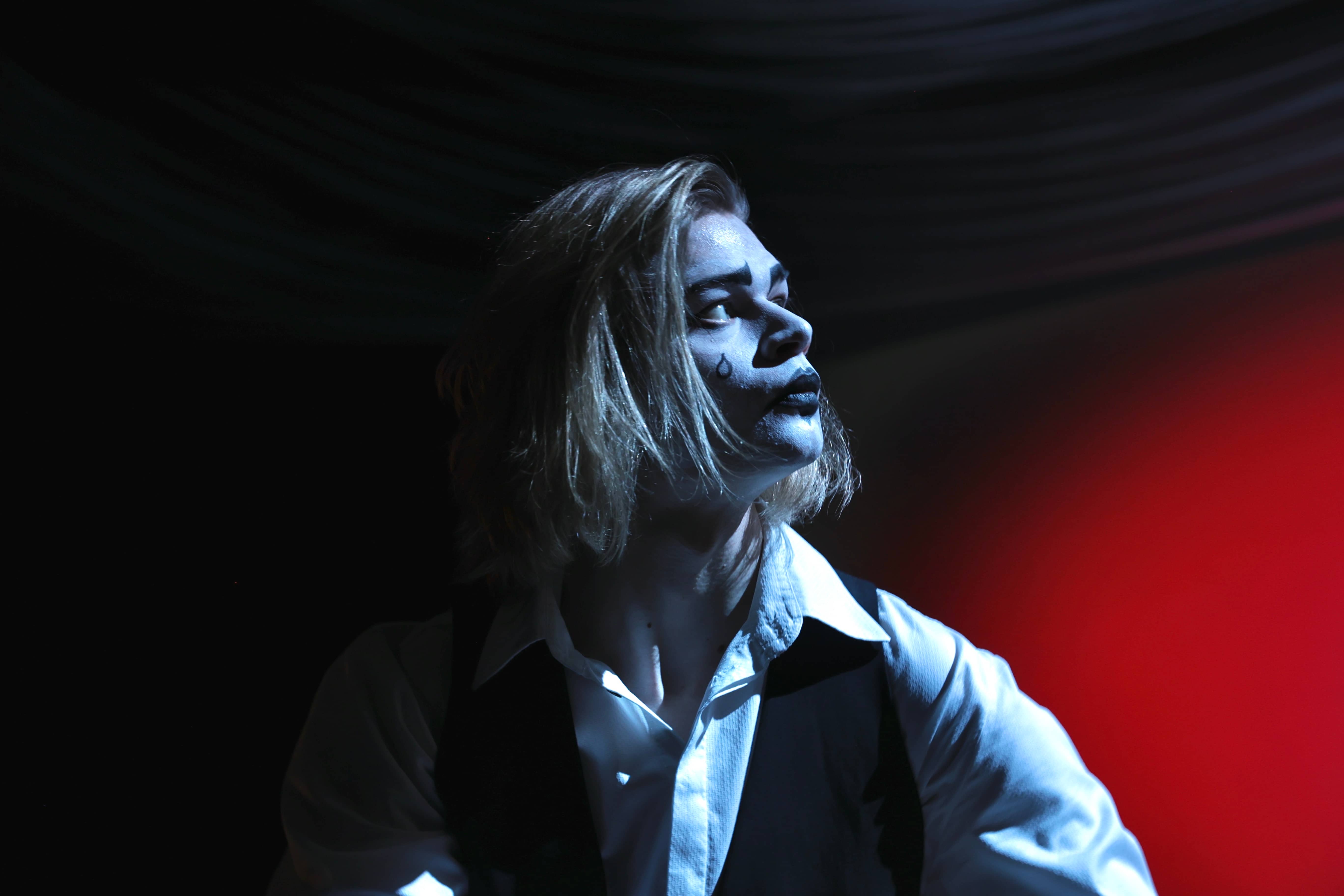 The concept crystallised from a single site visit to the Susie Sainsbury Theatre, where the intimacy of the space and its in-house infrastructure pointed toward a minimal material approach. A single plastic dust sheet became the production's central visual element, functioning simultaneously as veil, projection surface, and sculpture. Through a rehearsal-driven, collaborative process, shadow, red-saturated light, and rippling distortion evolved organically into the visual grammar of Pierrot's psychological descent.